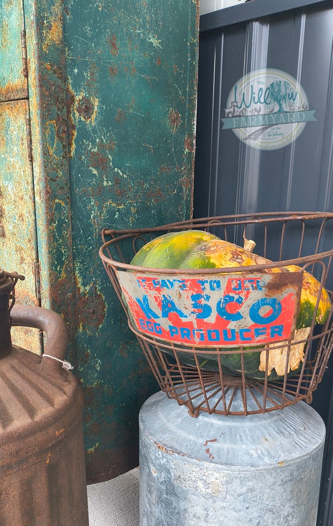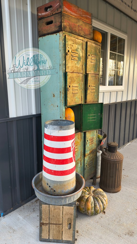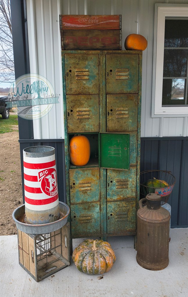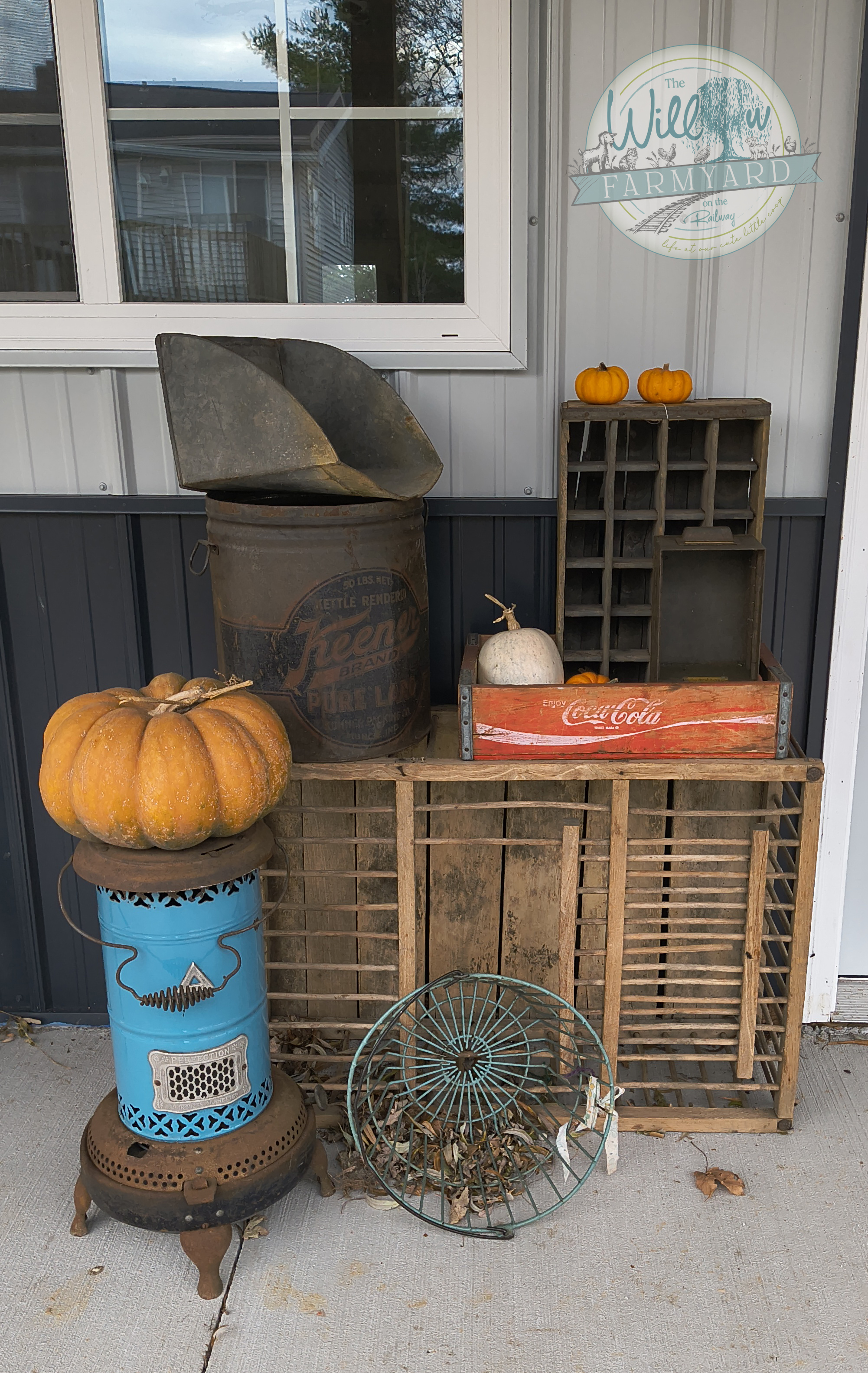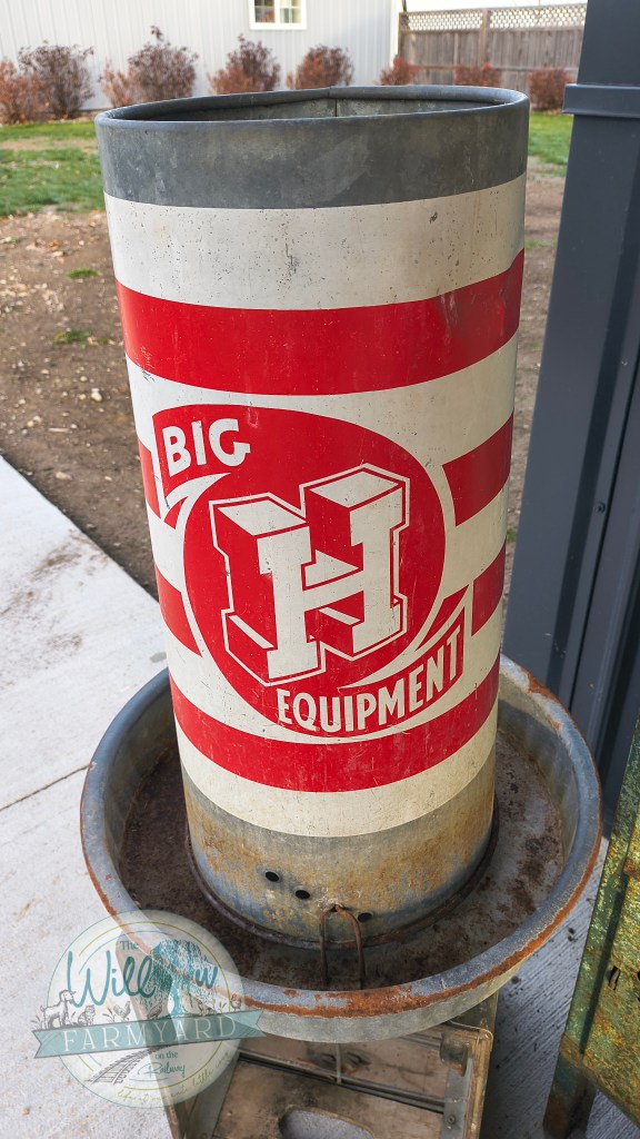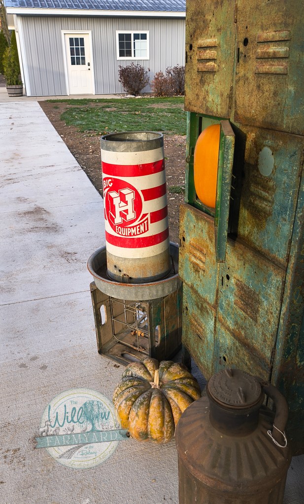 I bought this locker at a barn sale a few years back. I thought it would be really cool if we could turn it into nesting boxes for the chickens But then I found a legit set of vintage metal nesting boxes instead. Now the locker make a great addition to our new porch, along with a milk crate and a little rusty additions. I found the Big H chicken feeder just yesterday in Nashville, MI at Sweet Pickin Antiques & Collectibles. I really couldn’t say no to it. I love that it’s tall and has a nice graphic on it. I plan to put some greenery in it soon for the holidays.