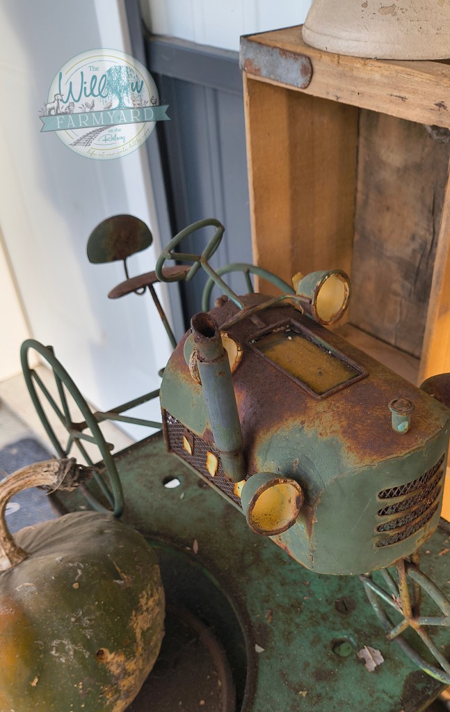 I love that vintage chicken crate and the teal kerosene heater! I grabbed the teal egg basket and really big metal scoop yesterday on our antique trip. And the red nail keg on the other side of the door is another of my new favorites. It will look great for the holidays! The vintage parking sign is something we picked up down south on a vacation. If you know me, you know how much I love signs! That one has a great chippy patina and the letters are embossed. and Check out this adorable little tractor. It might end up in my garden. But for now, it gets a spot on the porch.