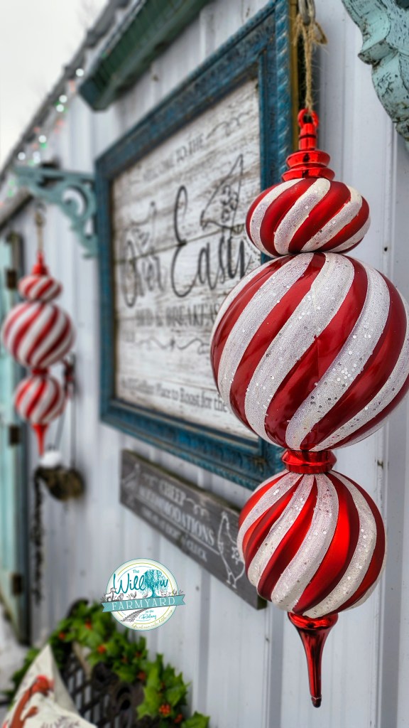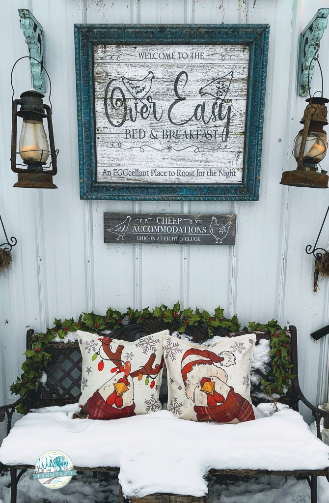 I normally hang vintage lanterns near my coop sign but I think these great large ornaments I purchased look really fantastic there this year! One of my favorite, and easiest, things to change for the seasons are the throw pillow covers on the old cast iron bench. And my door is always decorated with a sign or seasonal token, too.