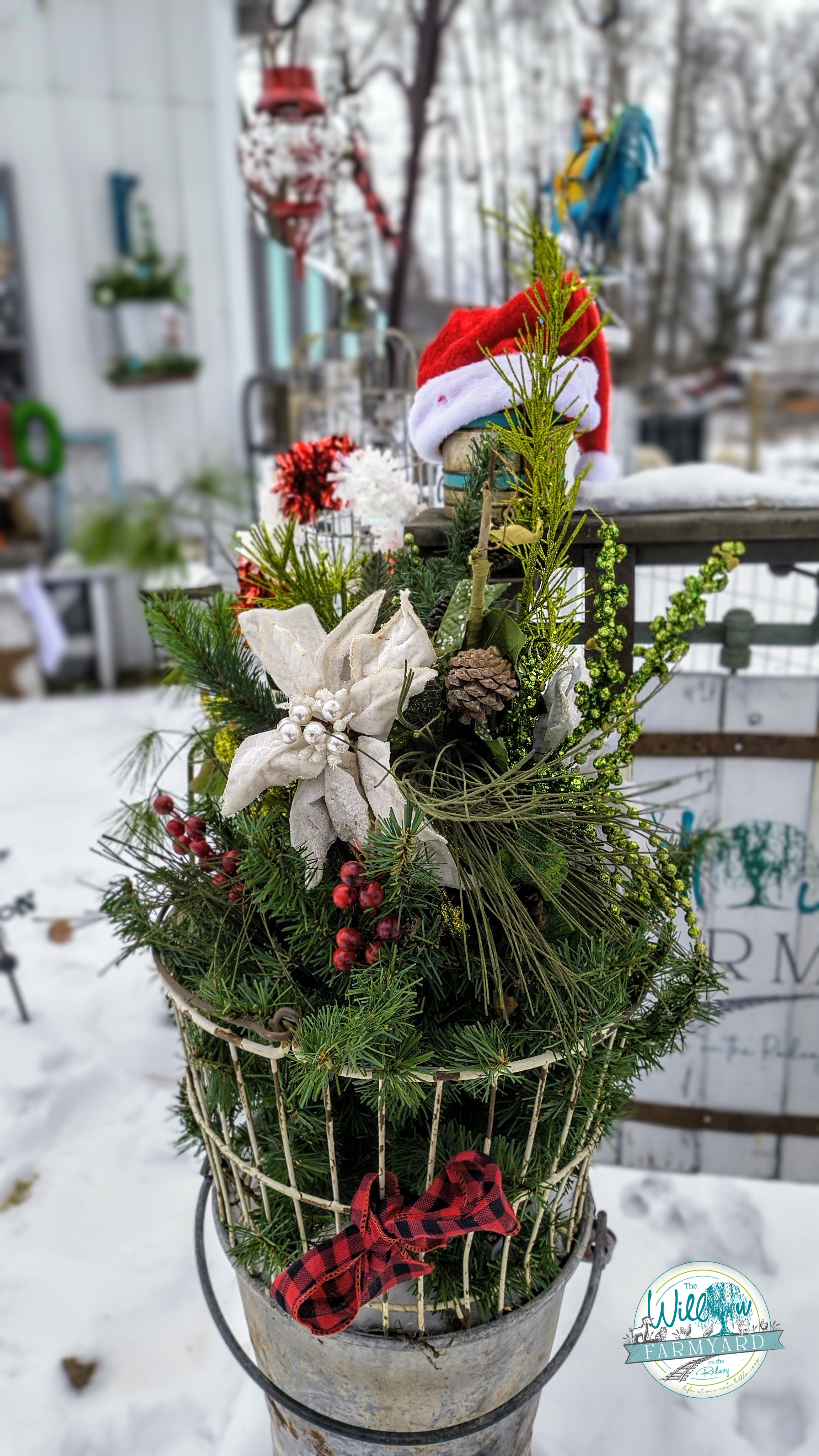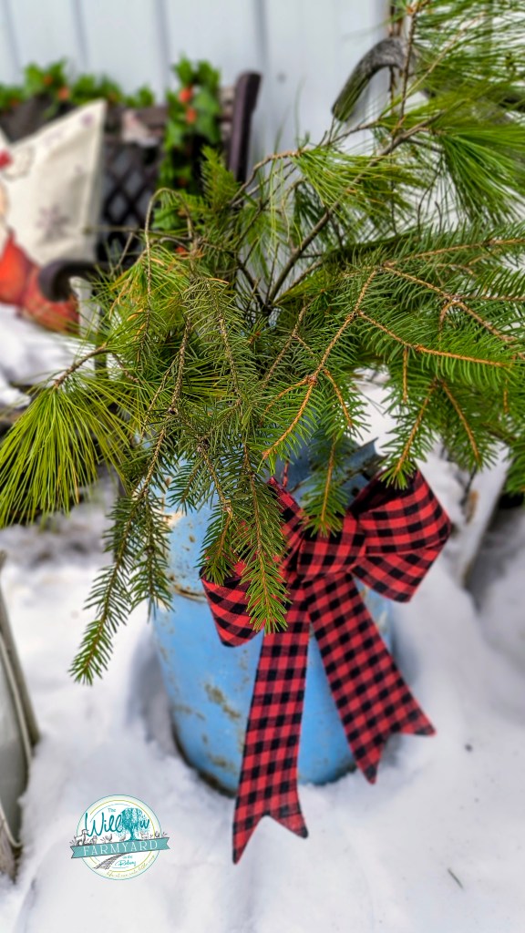 I try to add a touch of Christmas to each empty flower container and statement piece. Winter decorating can be a little tough, because the coop usually has a LOT of flower containers throughout spring, summer and fall. Adding some greenery or a dash of red to each spot, makes things look so very festive! I typically thrift most of my Christmas decorations or buy cheaper items from the dollar store. It just makes more sense to thrift things when they’re going to be out in the snow. And you can sometimes find some pretty unique things at the thrift store! When I can, I trim some pines in the yard to add some fresh greens to the mix. We don’t have much in the way of pines, but I am able to trim a little from what we do have. Time to plant more evergreens!