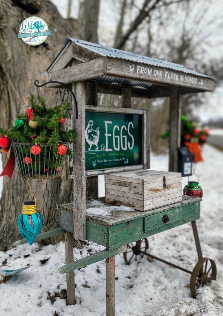 Even the egg cart gets decorated for the seasons. We don’t typically have many eggs for sale this time of year, but we do keep the cart out and throw some in there once in a while. Our ladies are seriously a bunch of free loaders for the winter! But, hey, I get it. If I could, I’d stay in my pajamas and try to get away with doing as little as possible when it’s cold out and dark so early!
