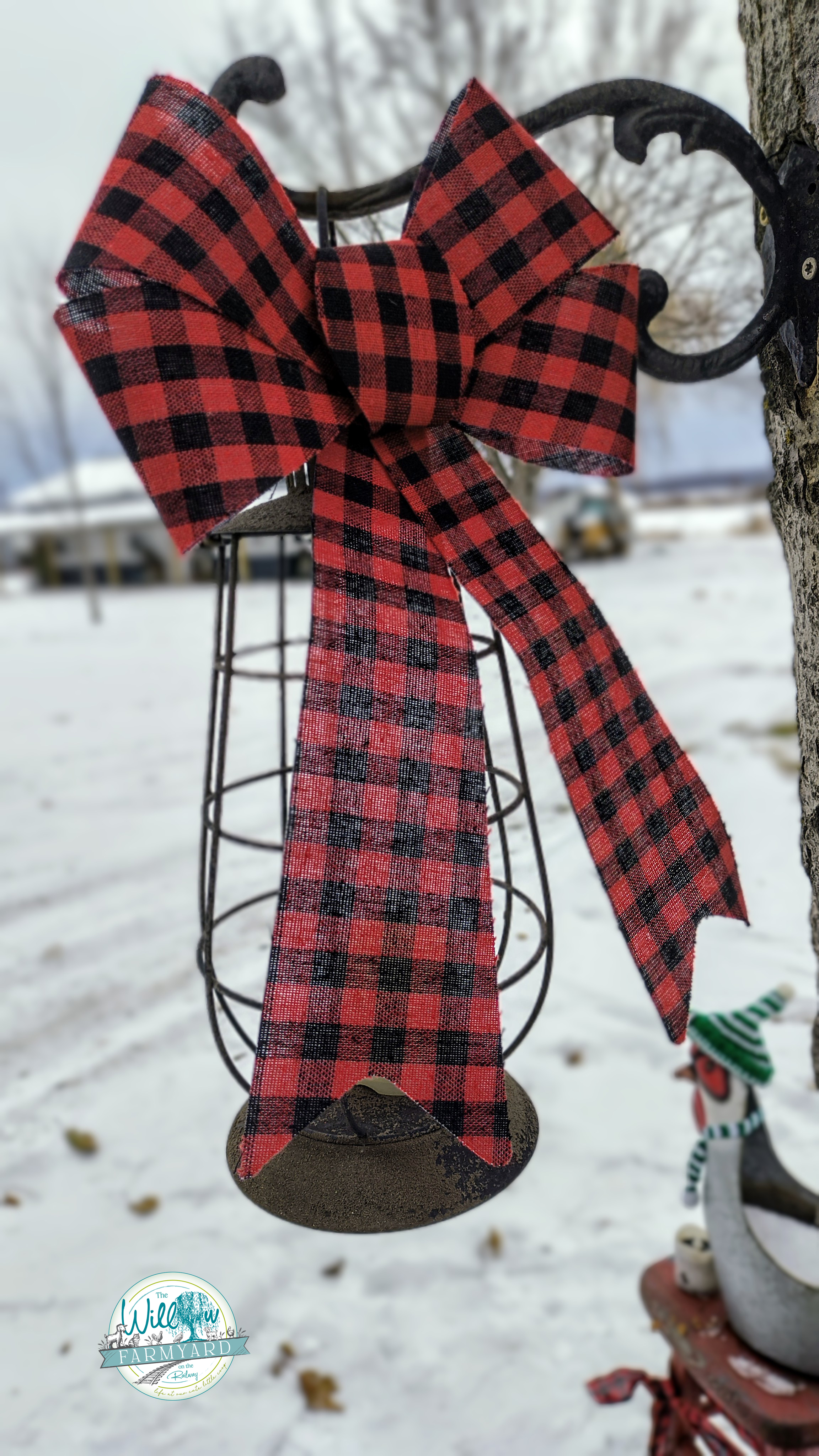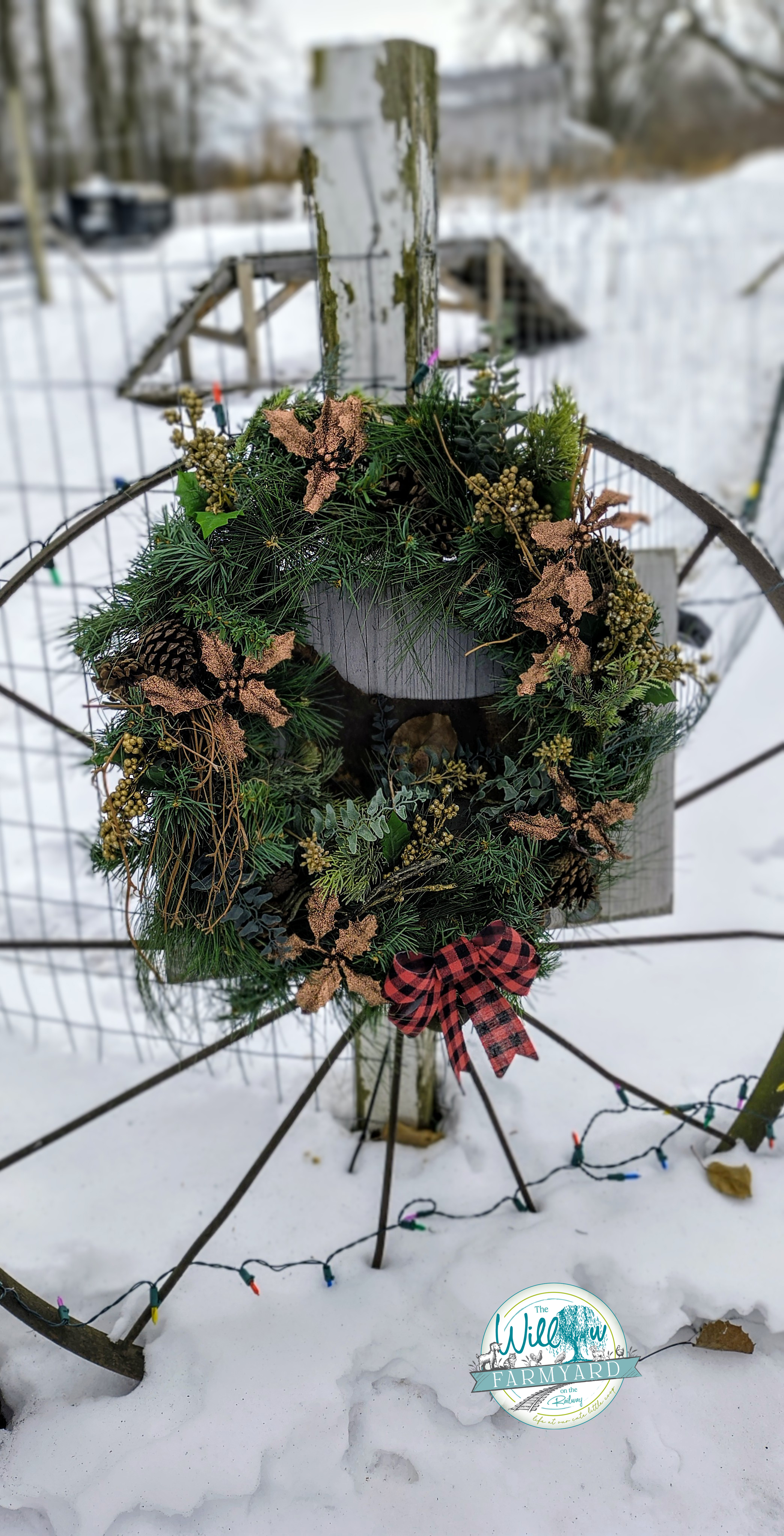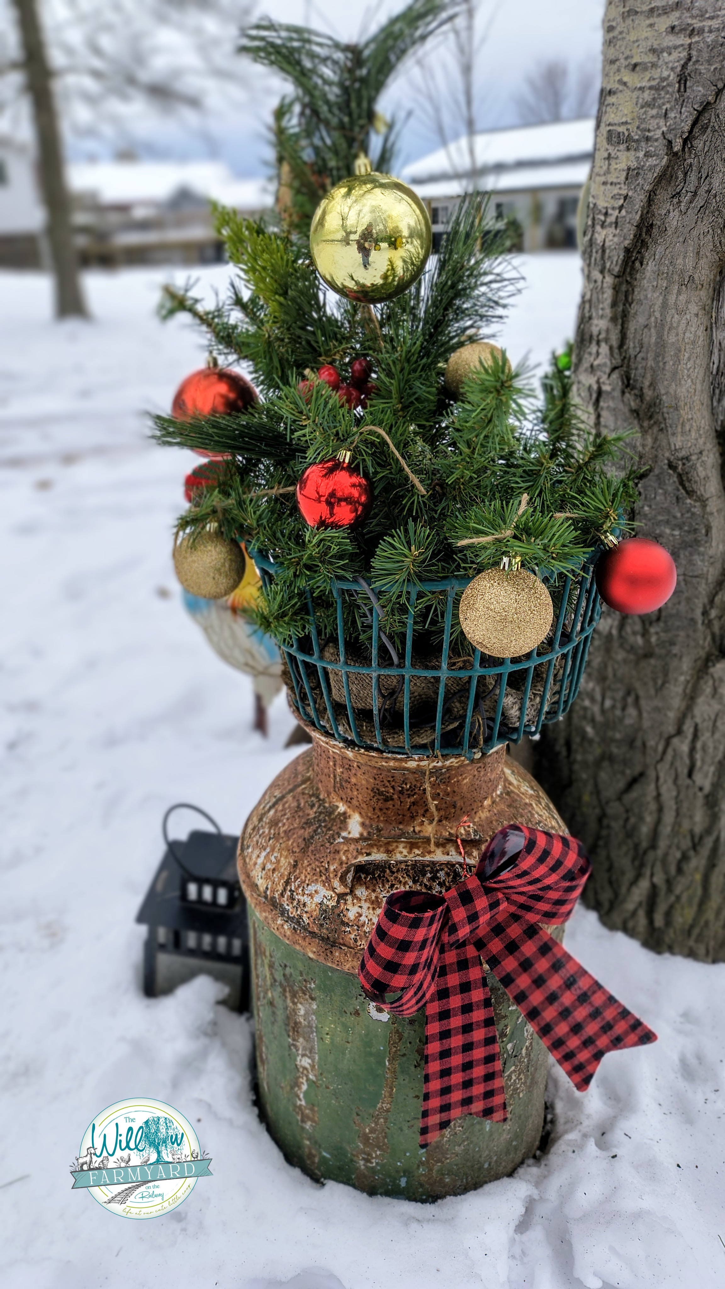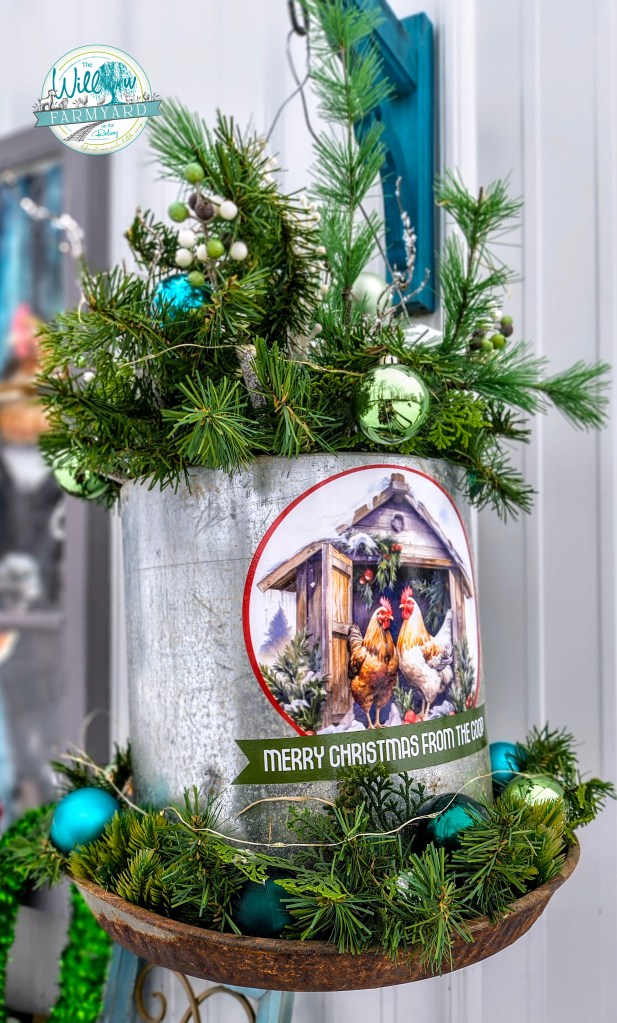 Near the coop’s sliding barn door, I have a lighted alpine tree, along with some greens and baubles, like this metal ornament I picked up from a craft sale a few years ago. And I normally add a lot of red ribbons for more festive cheer.