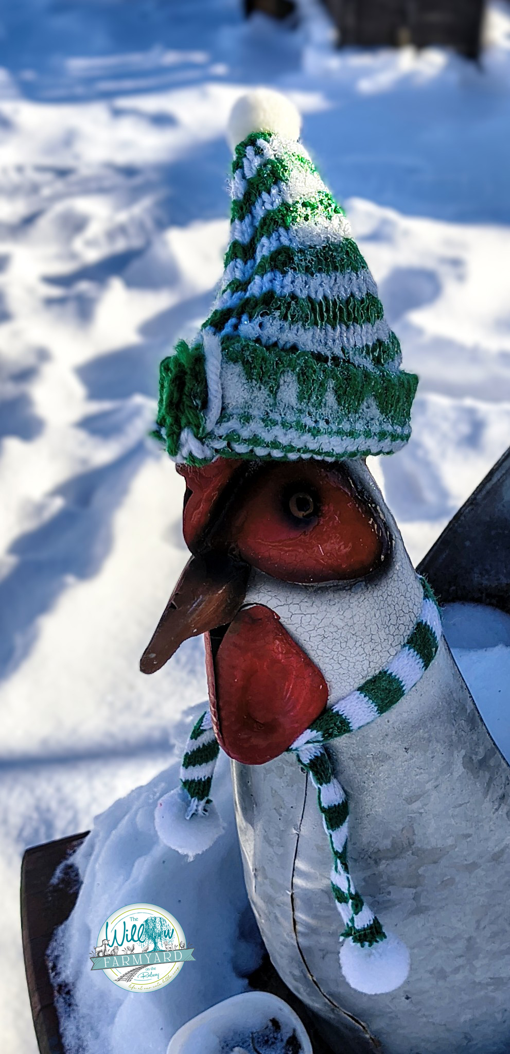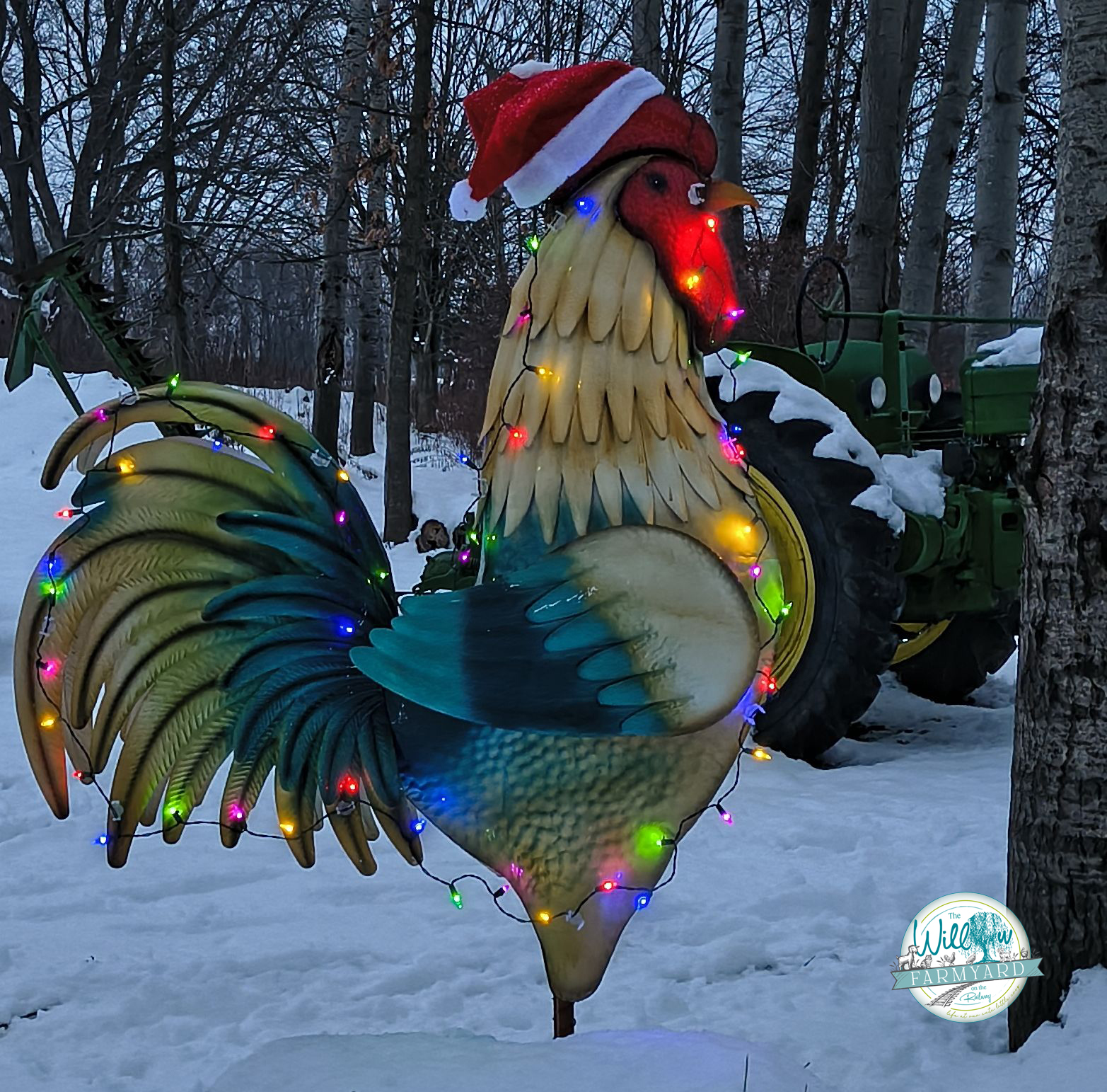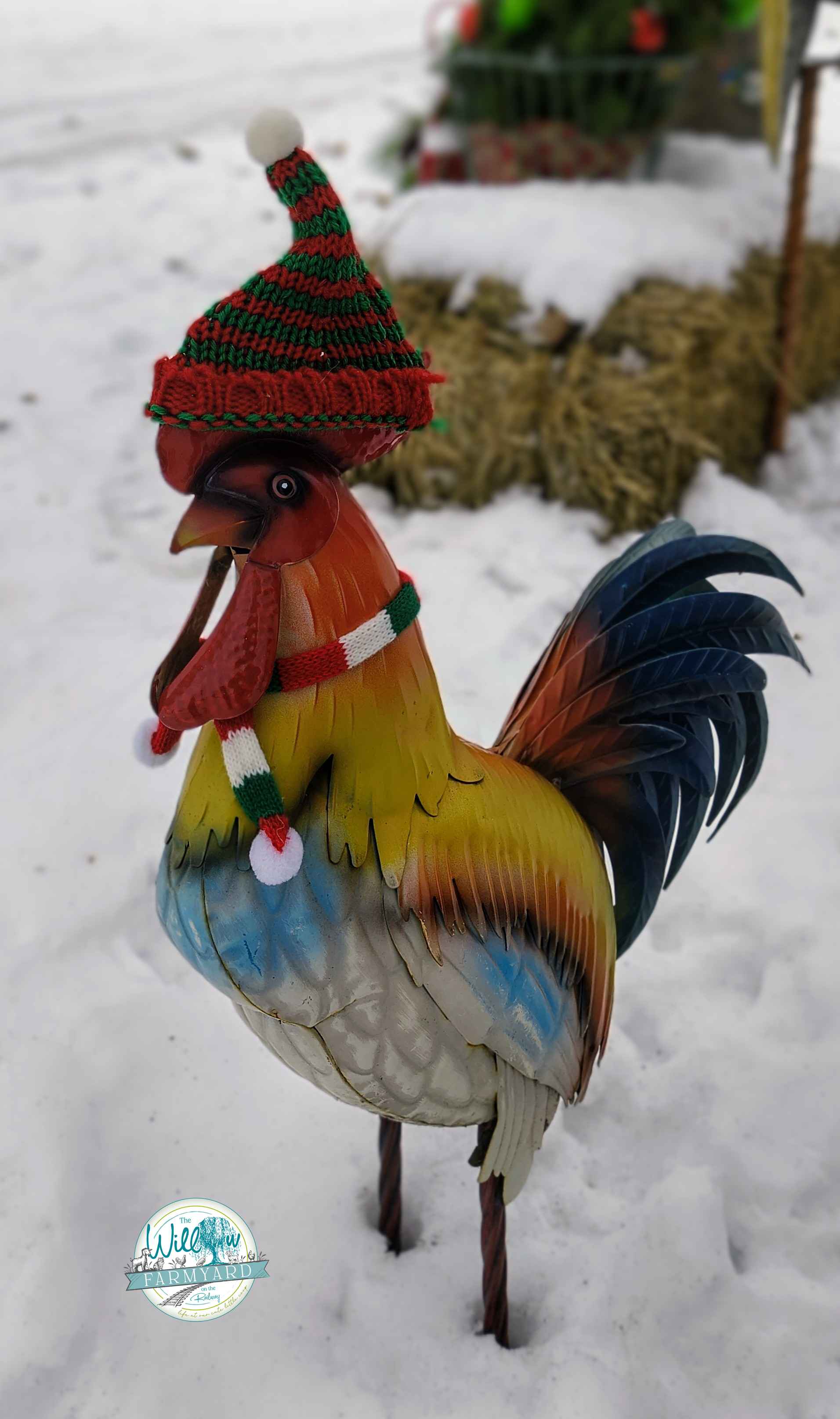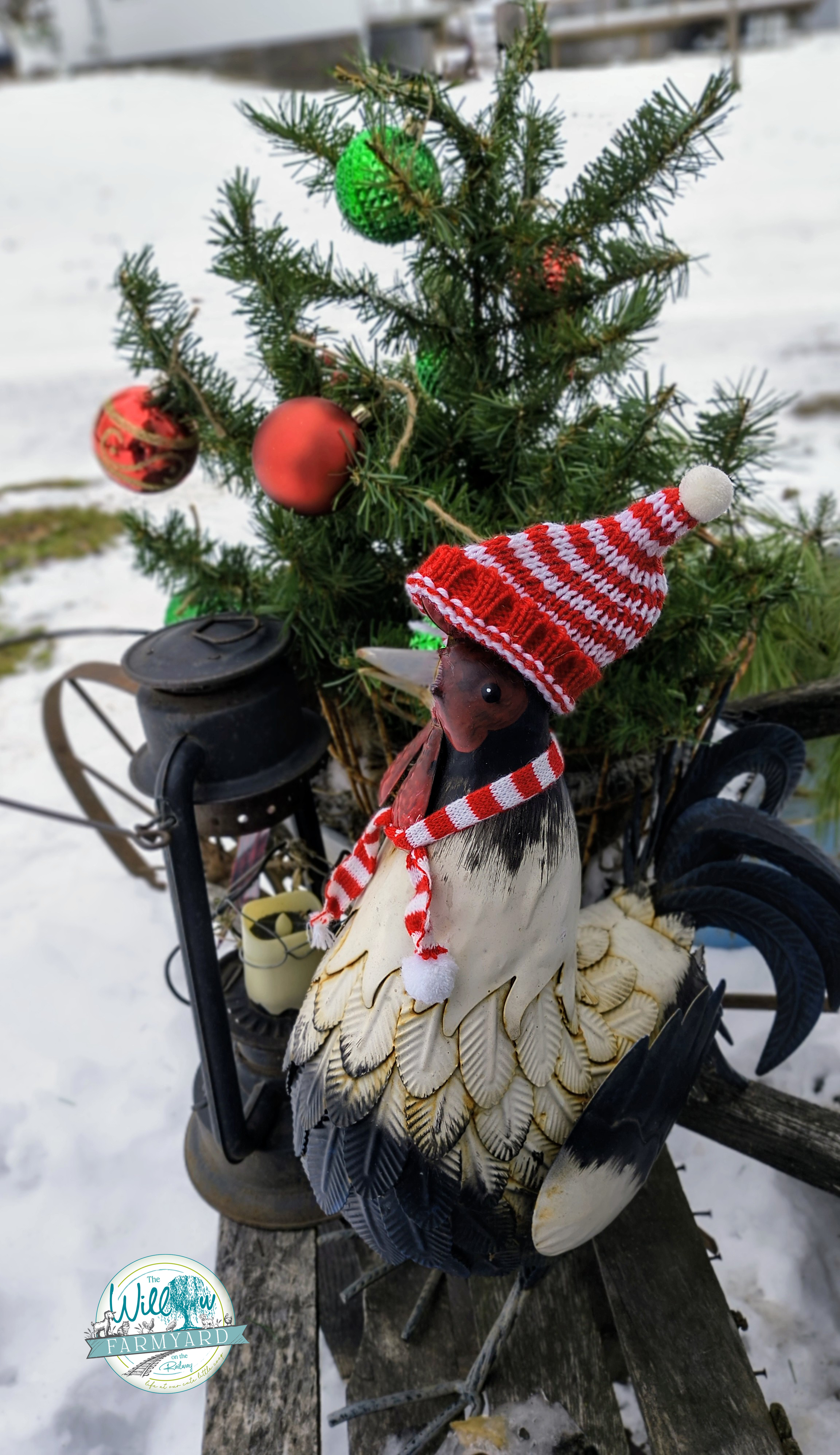 I have quite a few metal roosters around the coop. For Christmas, they’re all adorned with little stocking caps and scarves! And a santa hat fit perfectly on my large rooster.