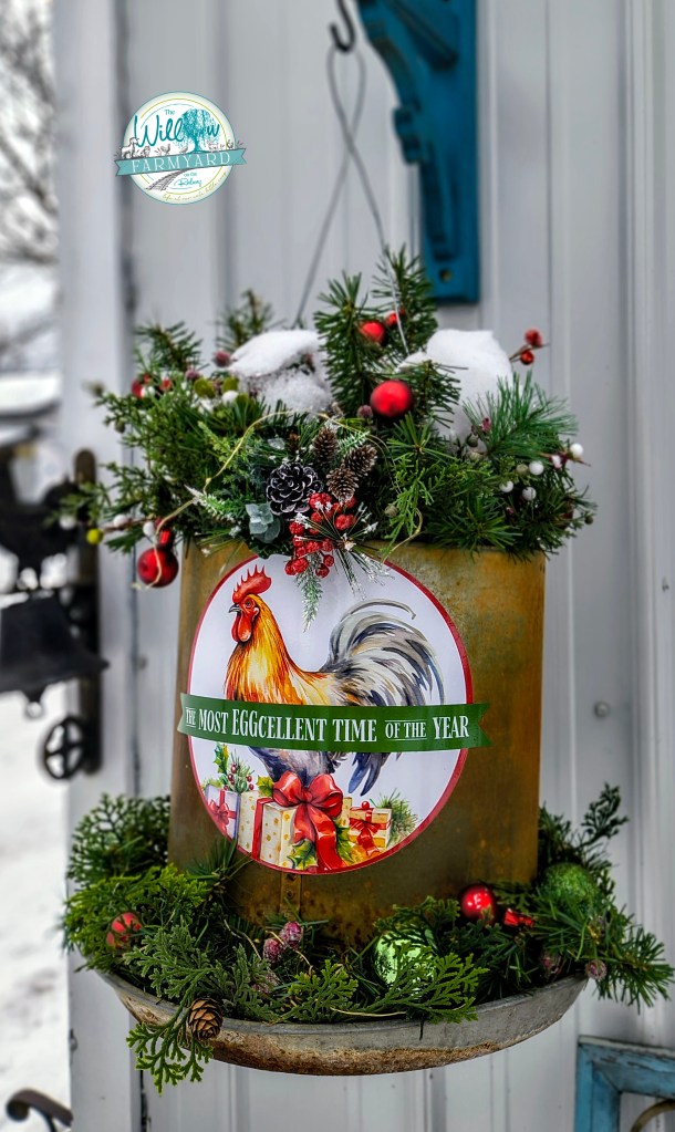 Egg baskets filled with flowers normally hang on the front of the coop. For Christmas, they are replaced with these feeders full of greens and bulbs, and fun Christmas graphics.