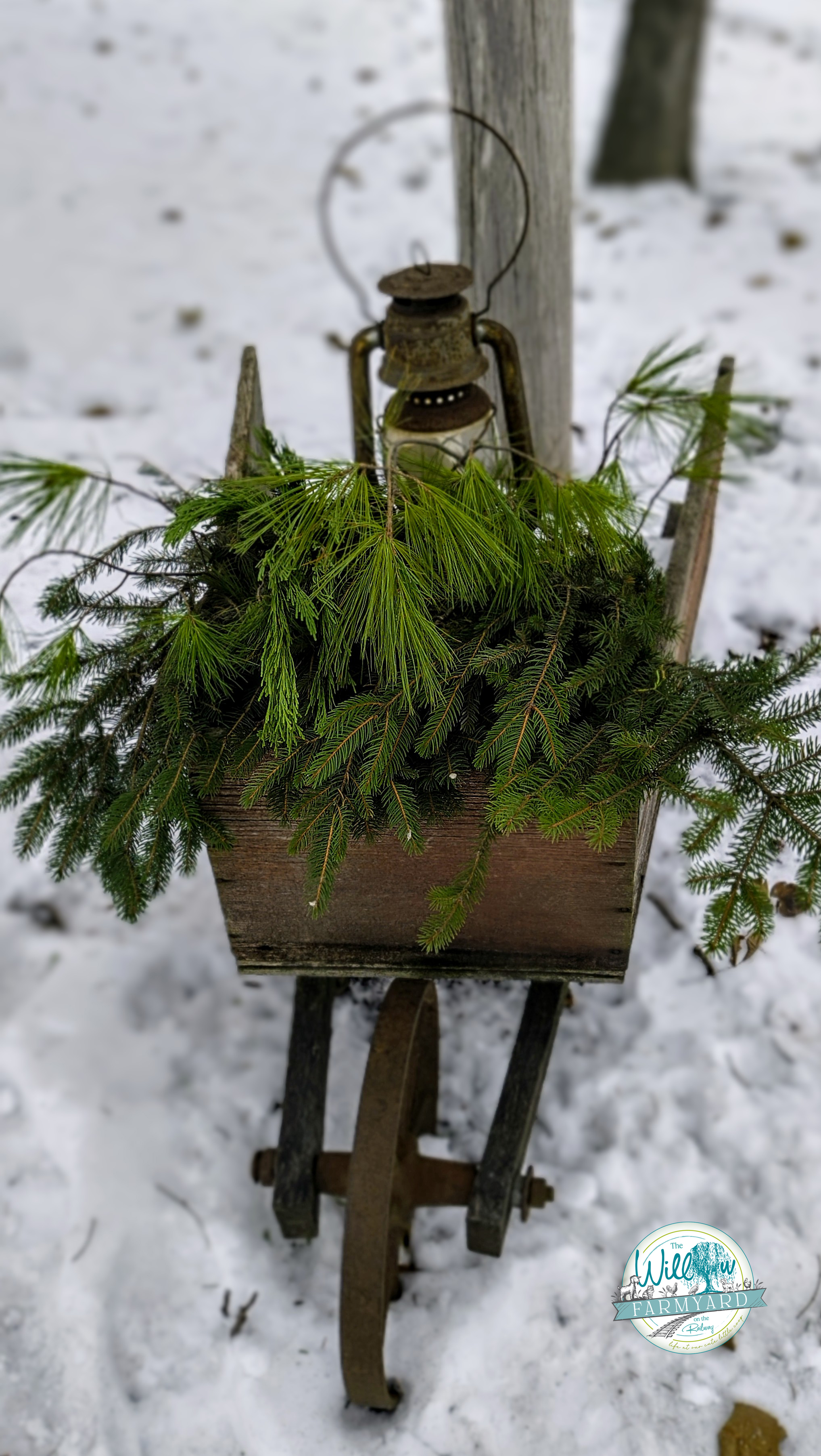 Each vignette around the coop gets something. The vintage wagon frame has garland and a little tree.