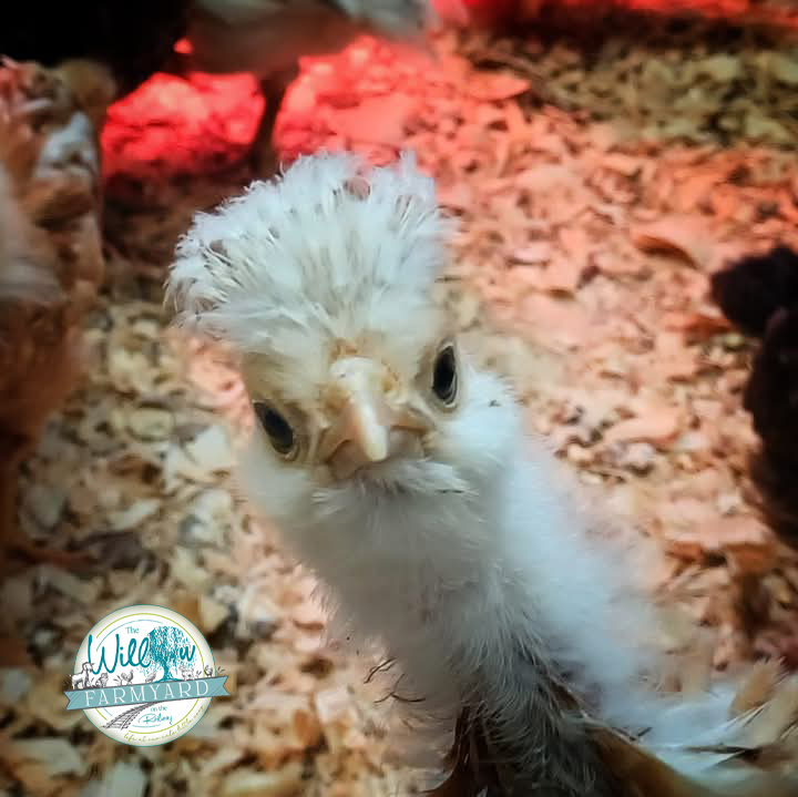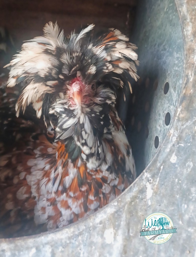Here i Becky as a chick. Turns out Becky was not a girl. But we still called him Becky. We did have to remove Becky from the farmyard because he got super-aggressive after his Polish brother, Dudley, got injured and had to be put down. But he was SO fun to watch. Not a bright star, this one.